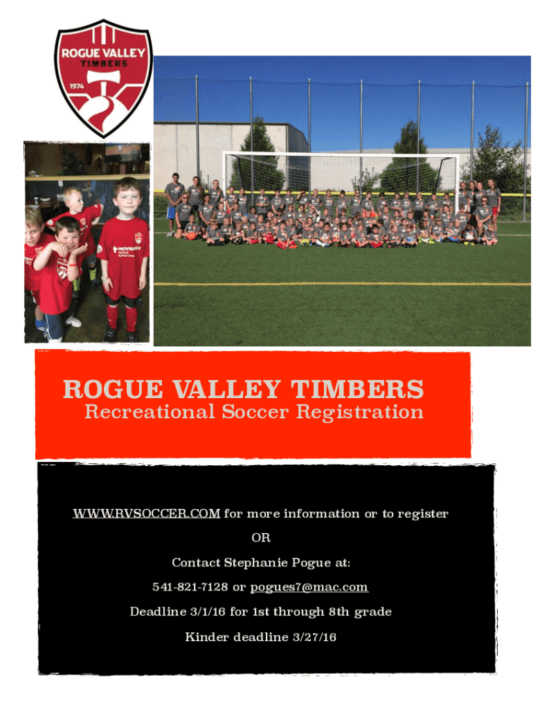 ROGUE VALLEY TIMBERSRecreational Soccer Registration WWW.RVSOCCER.COM for more information or to register OR Contact Stephanie Rogue at: 5418217128 or pogues7@mac.com Deadline 3/1/16 for 1st through