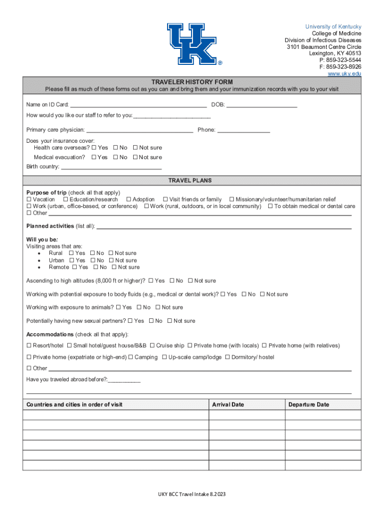University of Kentucky College of Medicine Division of Infectious Diseases 3101 Beaumont Centre Circle Lexington, KY 40513 P: 8593235544 F: 8593238926 www.uky.eduTRAVELER HISTORY FORMPlease fill as
