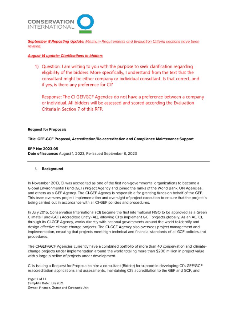 September 8 Reposting Update: Minimum Requirements and Evaluation Criteria sections have been revised. August 14 update: Clarifications to bidders1) Question: I am writing to you with the purpose