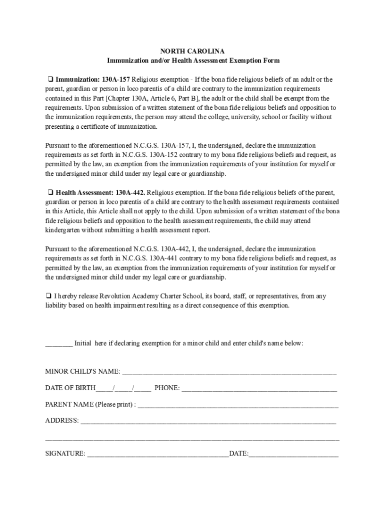 NORTH CAROLINA Immunization and/or Health Assessment Exemption Form Immunization: 130A157 Religious exemption If the bona fide religious beliefs of an adult or the parent, guardian or person in loco