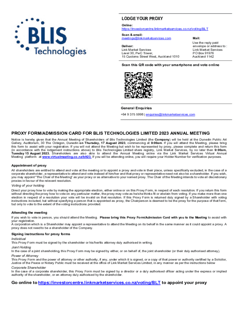 Get the free Proxy Form for Blis Technologies Annual Meeting