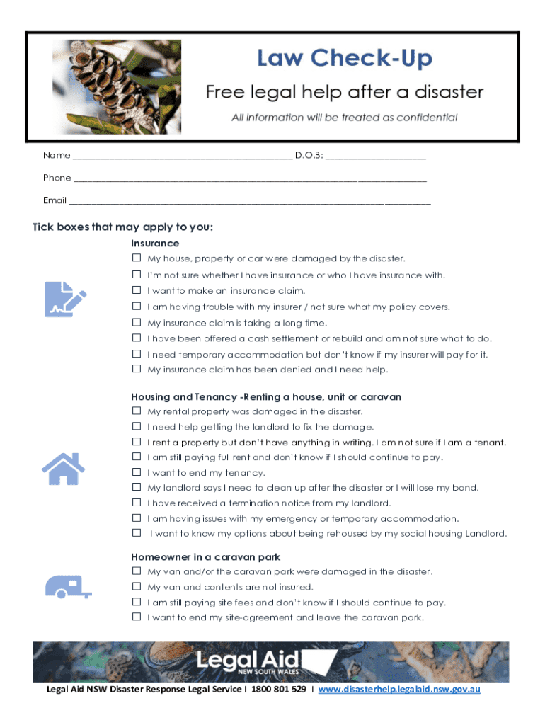 Name ___ D.O.B: ___ Phone ___ Email ___Tick boxes that may apply to you: Insurance My house, property or car were damaged by the disaster. Im not sure whether I have insurance or who I have insurance