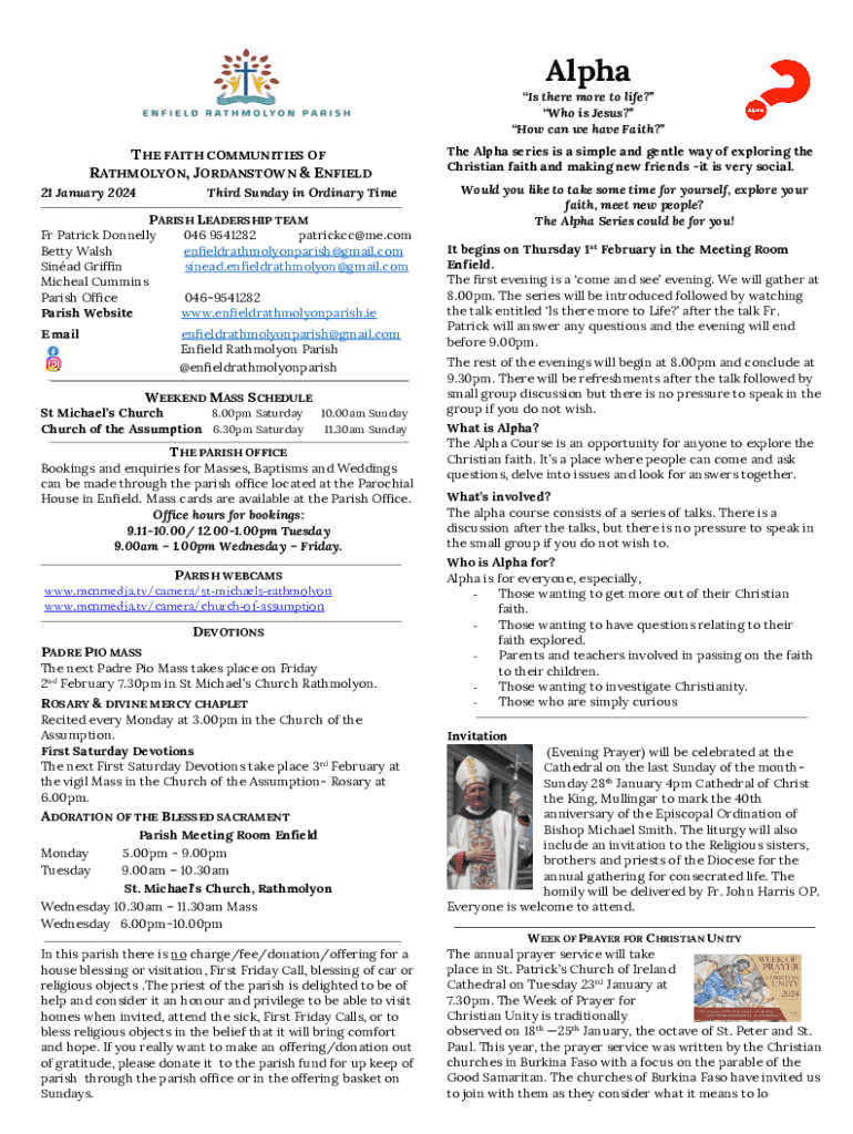 AlphaIs there more to life? Who is Jesus? How can we have Faith?THE FAITH COMMUNITIES OF RATHMOLYON, JORDANSTOWN & ENFIELD 21 January 2024Third Sunday in Ordinary TimePARISH LEADERSHIP TEAMFr Patrick
