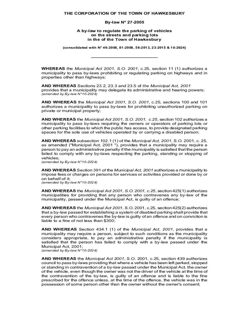 THE CORPORATION OF THE TOWN OF HAWKESBURY Bylaw N 272005 A bylaw to regulate the parking of vehicles on the streets and parking lots in the of the Town of Hawkesbury (consolidated with N 462008, 812008,