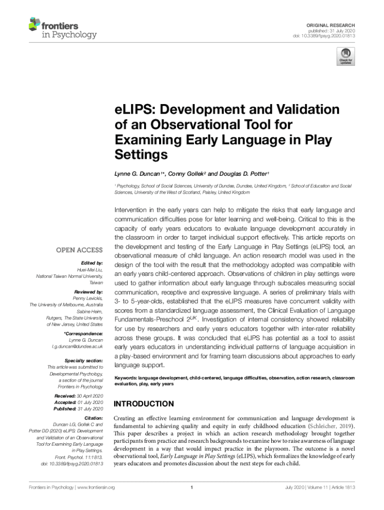 ORIGINAL RESEARCH published: 31 July 2020 doi: 10.3389/fpsyg.2020.01813eLIPS: Development and Validation of an Observational Tool for Examining Early Language in Play Settings Lynne G. Duncan 1* ,