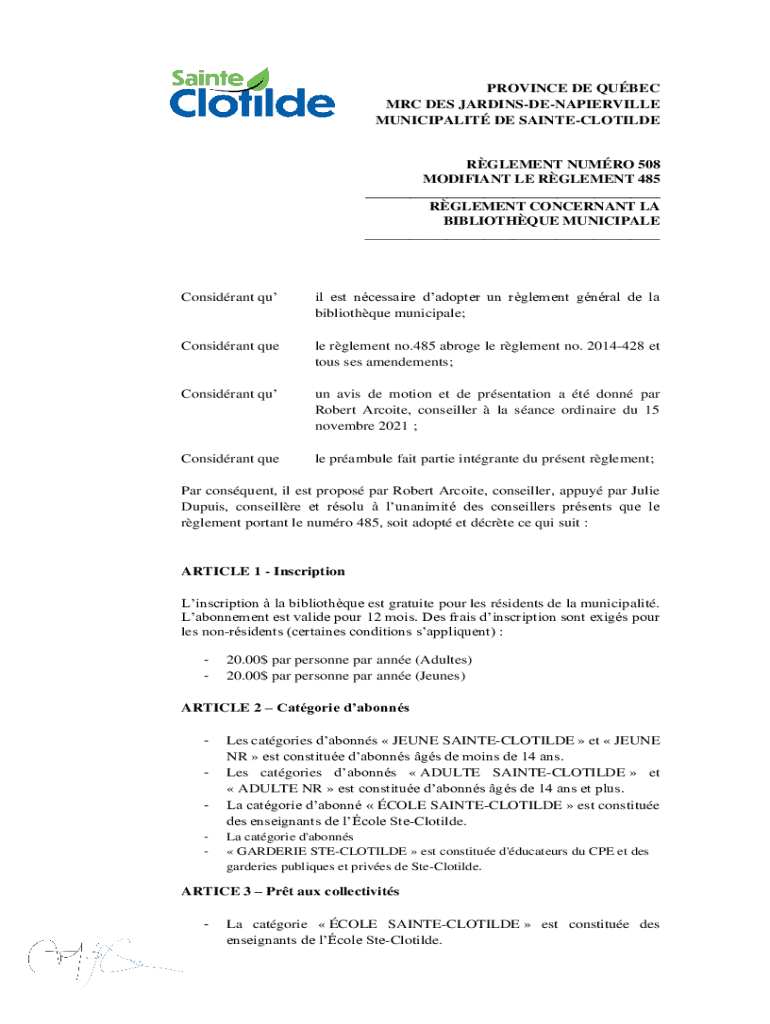 PROVINCE DE QUBEC MRC DES JARDINSDENAPIERVILLE MUNICIPALIT DE SAINTECLOTILDERGLEMENT NUMRO 508 MODIFIANT LE RGLEMENT 485 ___ RGLEMENT CONCERNANT LA BIBLIOTHQUE MUNICIPALE ___Considrant quil est ncessaire