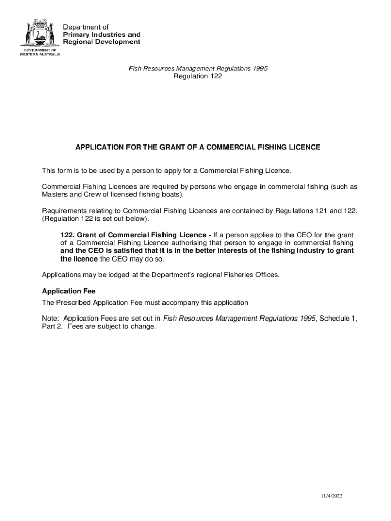 Fish Resources Management Regulations 1995Regulation 122APPLICATION FOR THE GRANT OF A COMMERCIAL FISHING LICENCEThis form is to be used by a person to apply for a Commercial Fishing License. Commercial