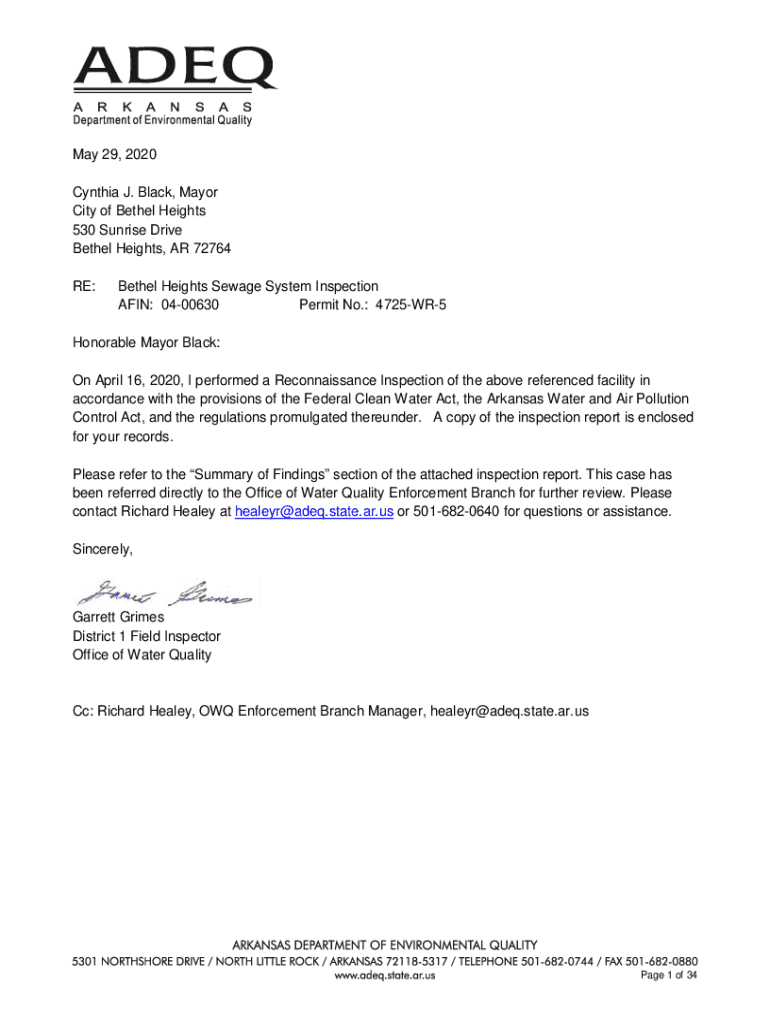 May 29, 2020, Cynthia J. Black, Mayor City of Ethel Heights 530 Sunrise Drive Ethel Heights, AR 72764 RE:Ethel Heights Sewage System Inspection AKIN: 0400630 Permit No.: 4725WR5Honorable Mayor Black: