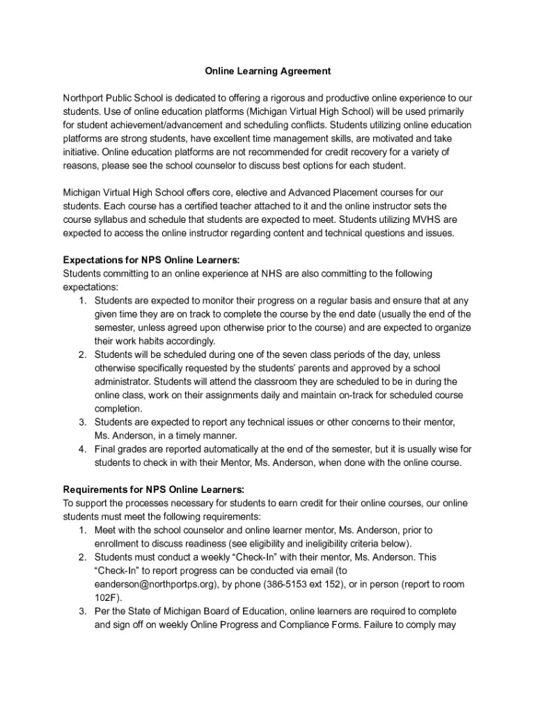 Online Learning Agreement Northport Public School is dedicated to offering a rigorous and productive online experience to our students. Use of online education platforms (Michigan Virtual High School)