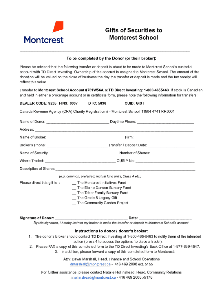 Gifts of Securities to Mont crest School ___To be completed by the Donor (or their broker): Please be advised that the following transfer or deposit is about to be made to Mont crest Schools custodial