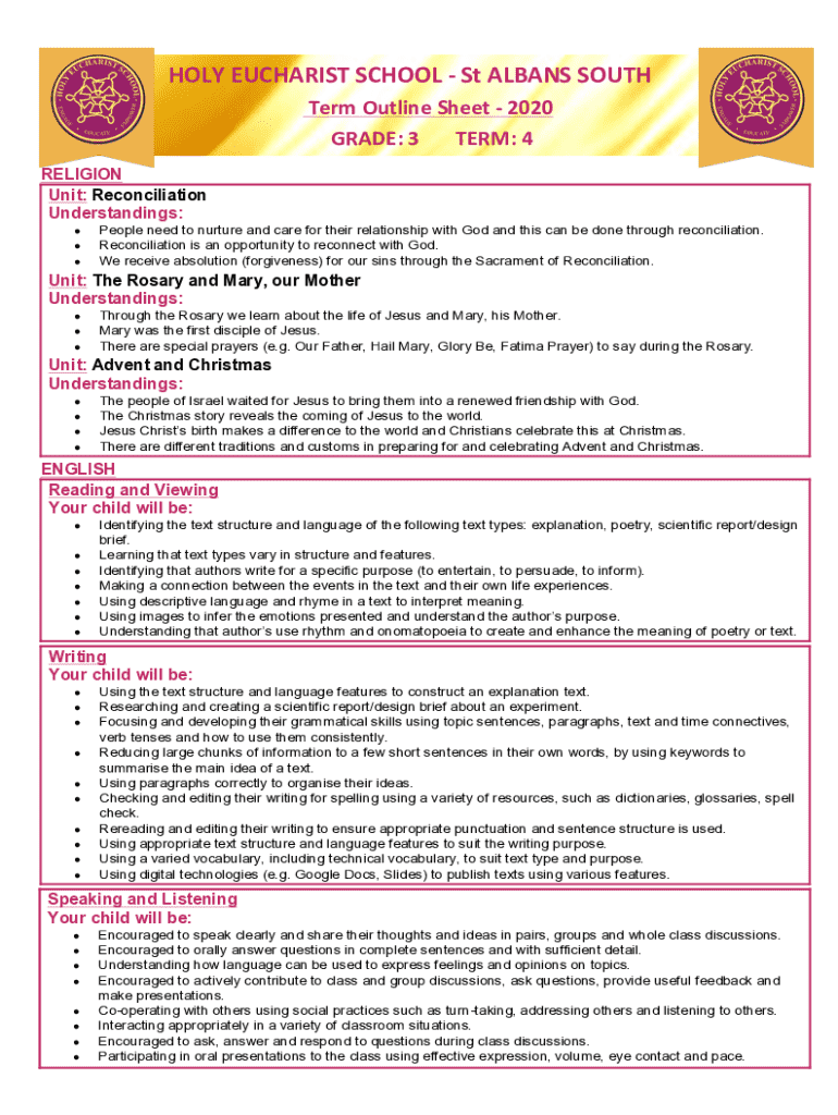 HOLY EUCHARIST SCHOOL St ALBANS SOUTH Term Outline Sheet 2020 GRADE: 3 TERM: 4 RELIGION Unit: Reconciliation Understandings: People need to nurture and care for their relationship with God and this