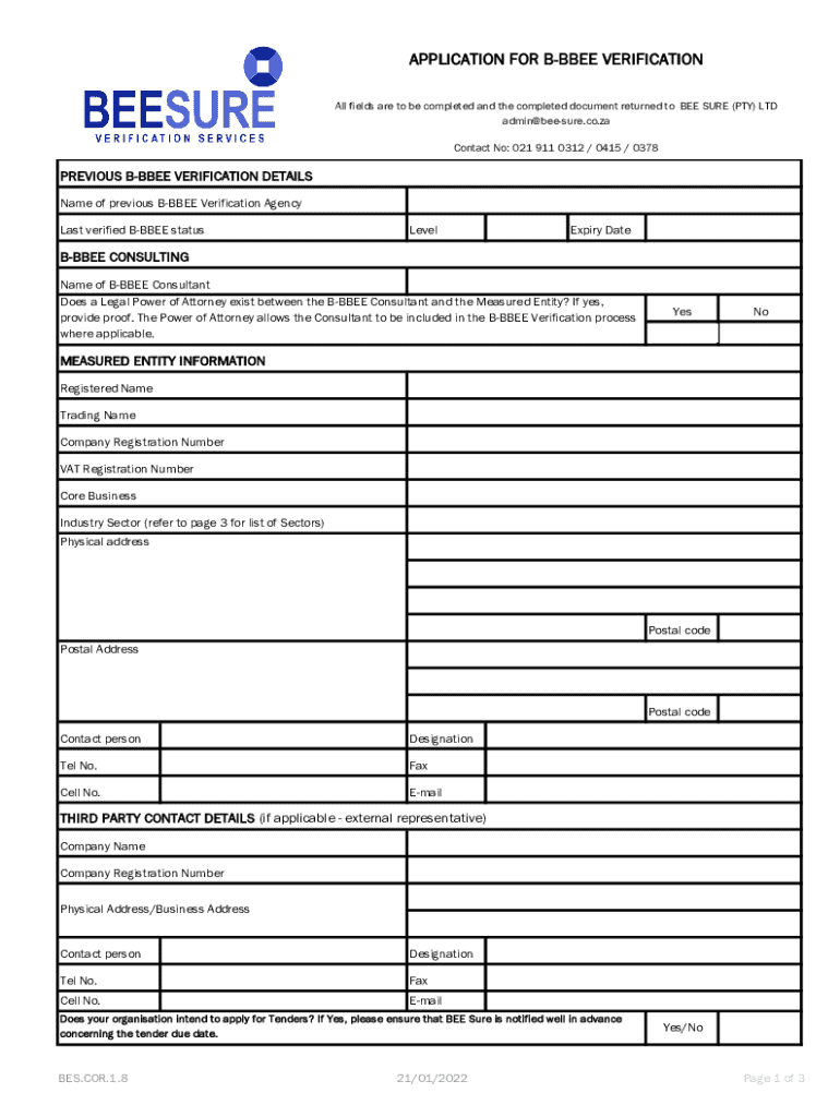 APPLICATION FOR BBBEE VERIFICATION All fields are to be completed and the completed document returned to BEE SURE (PTY) LTD admin@beesure.co.za Contact No: 021 911 0312 / 0415 / 0378PREVIOUS BBBEE