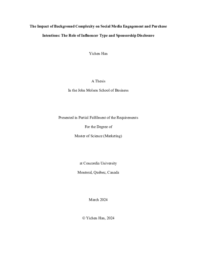 The Impact of Background Complexity on Social Media Engagement and Purchase Intentions: The Role of Influencer Type and Sponsorship DisclosureYichen HanA Thesis In the John Molson School of BusinessPresented