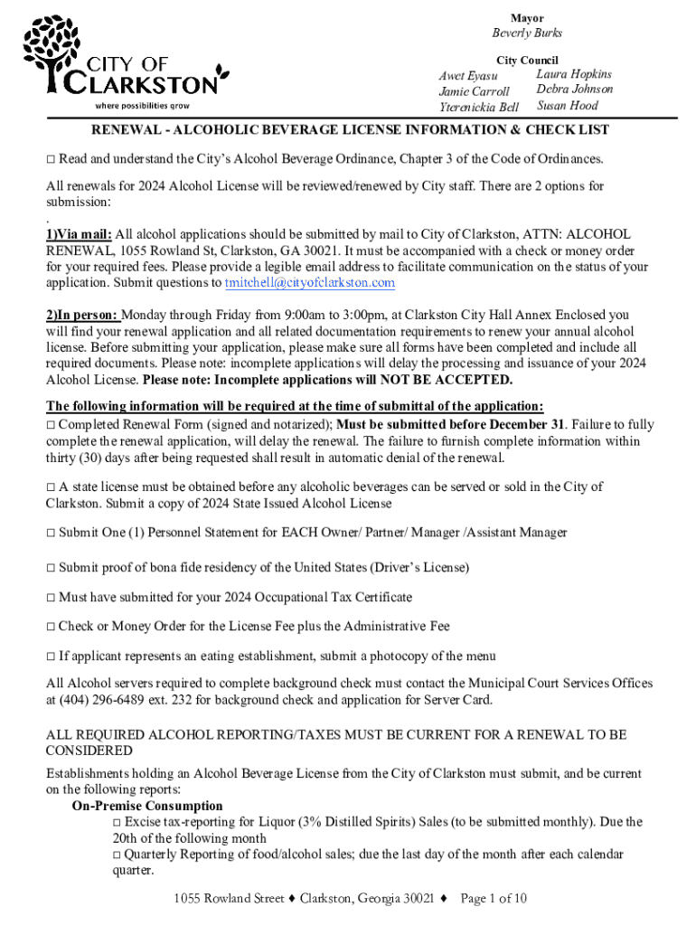 MayorBeverly Burks City CouncilAwet Eyasu Jamie Carroll Yterenickia BellLaura Hopkins Debra Johnson Susan HoodRENEWAL ALCOHOLIC BEVERAGE LICENSE INFORMATION & CHECK LIST Read and understand the Citys