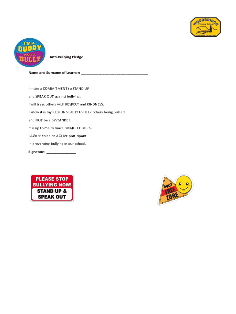 AntiBullying PledgeName and Surname of Learner: ___I make a COMMITMENT to STAND UP and SPEAK OUT against bullying. I will treat others with RESPECT and KINDNESS. I know it is my RESPONSIBILITY to