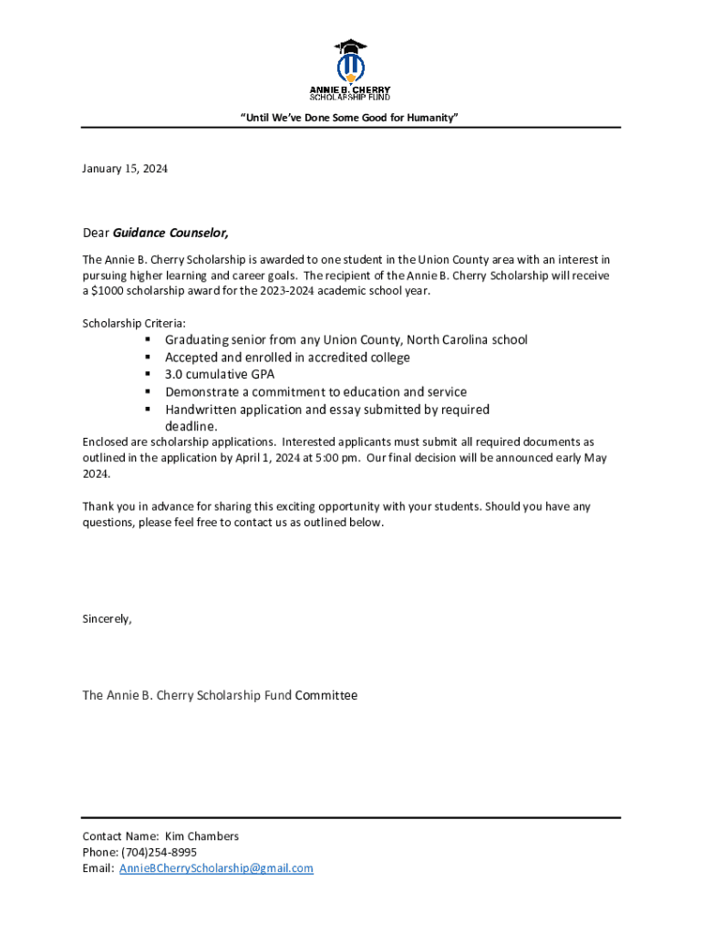 Until We've Done Some Good for Humanity January 15, 2024Dear Guidance Counselor, The Annie B. Cherry Scholarship is awarded to one student in the Union County area with an interest in pursuing higher
