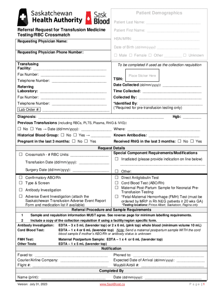 Get the free Referral Request for Transfusion Medicine Testing/RBC Crossmatch