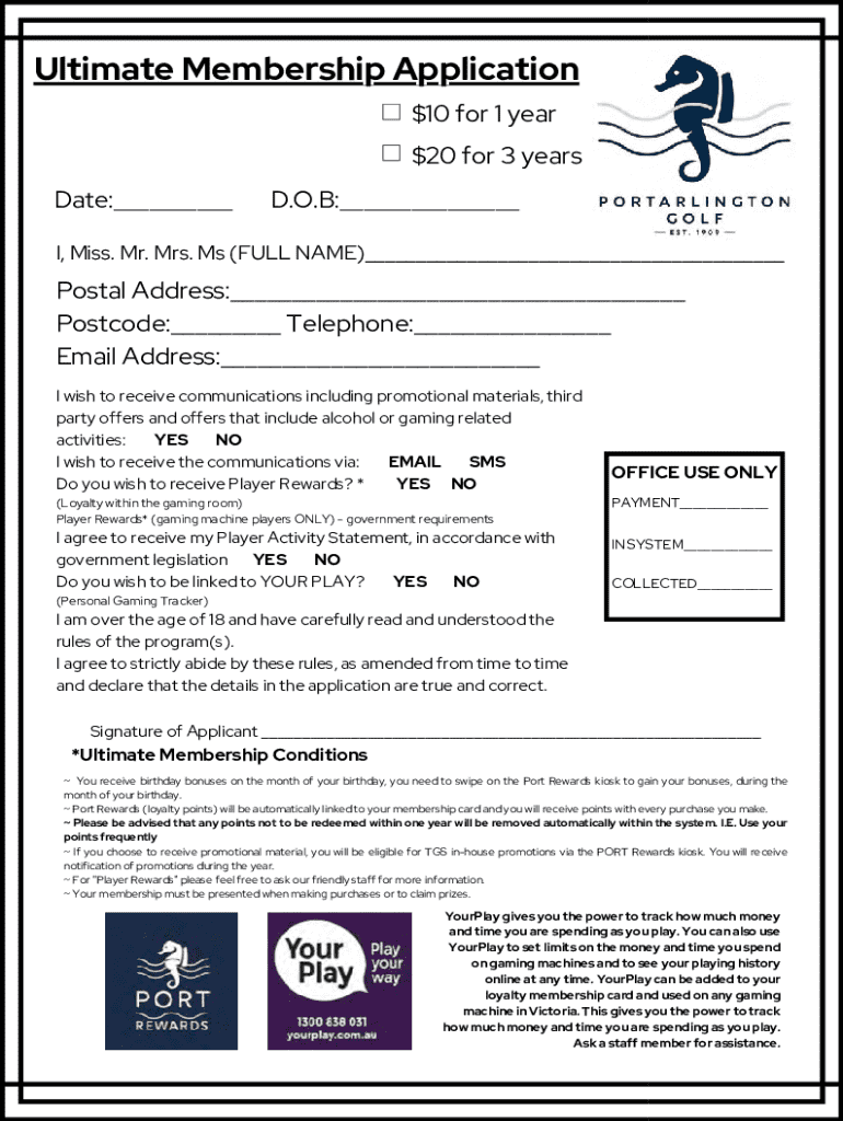 Ultimate Membership Application $10 for 1 year $20 for 3 years Date:___D.O.B:___I, Miss. Mr. Mrs. Ms (FULL NAME)___Postal Address:___ Postcode:___ Telephone:___ Email Address:___ I wish to receive