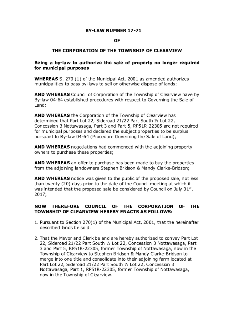 BYLAW NUMBER 1771 OF THE CORPORATION OF THE TOWNSHIP OF CLEARVIEW Being a bylaw to authorize the sale of property no longer required for municipal purposes WHEREAS S. 270 (1) of the Municipal Act,