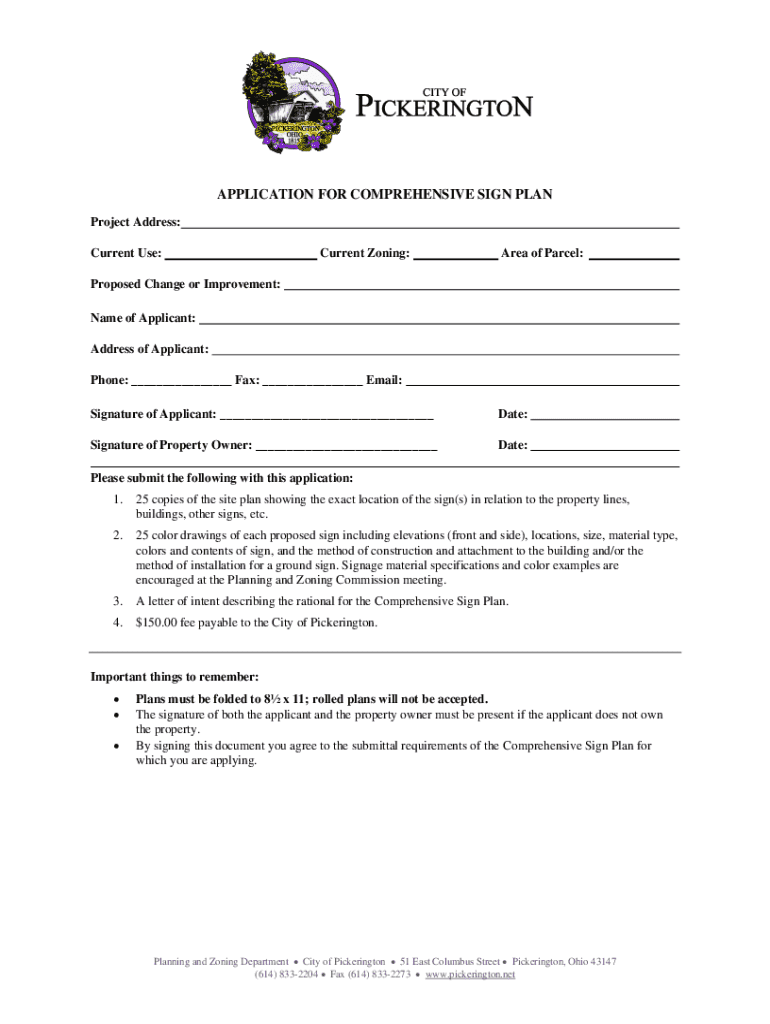 APPLICATION FOR COMPREHENSIVE SIGN PLAN Project Address: Current Use:Current Zoning:Area of Parcel:Proposed Change or Improvement: Name of Applicant: Address of Applicant: Phone: ___ Fax: ___ Email: