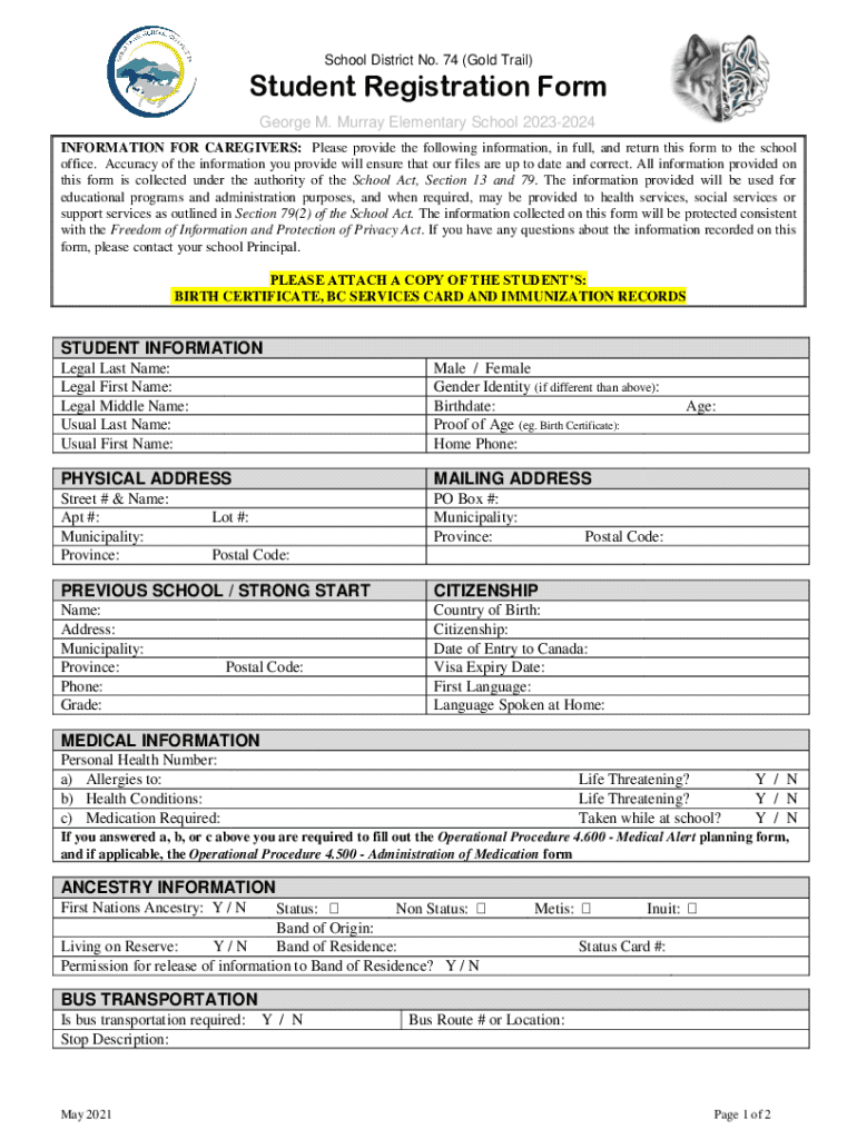 School District No. 74 (Gold Trail)Student Registration Form George M. Murray Elementary School 20232024 INFORMATION FOR CAREGIVERS: Please provide the following information, in full, and return this