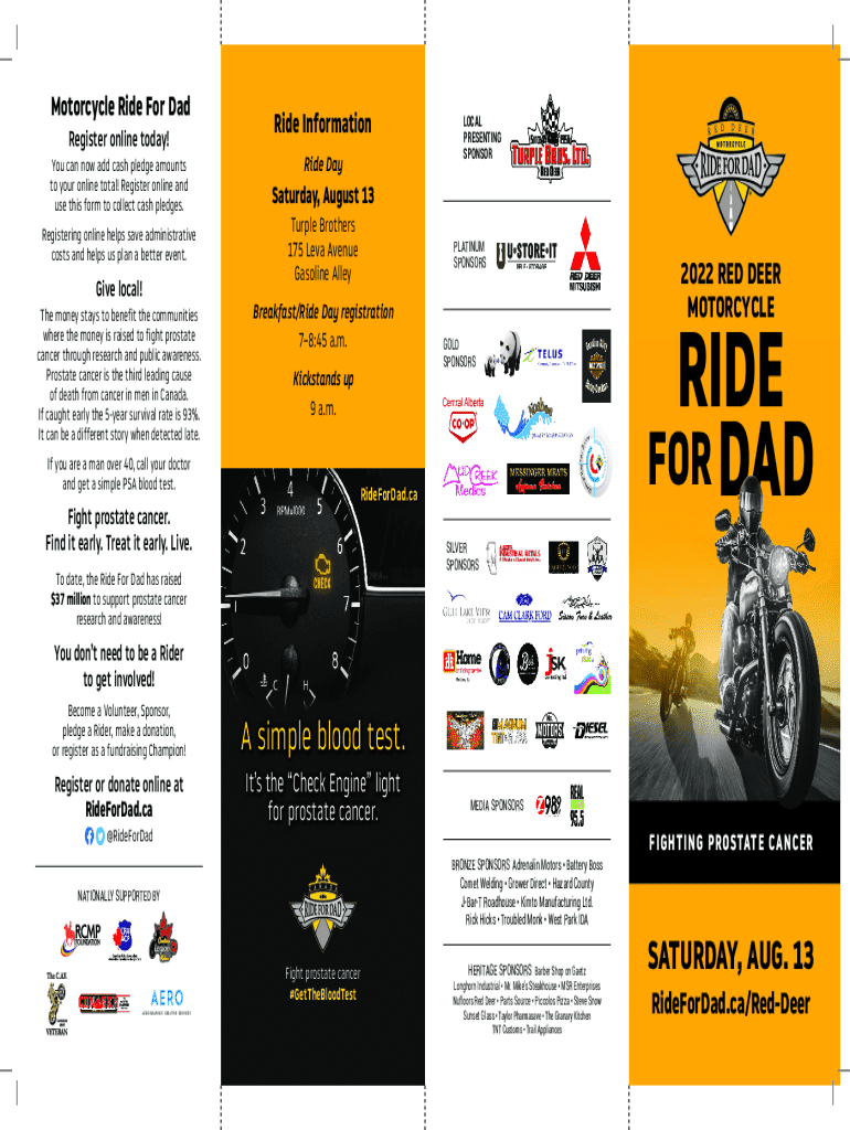Motorcycle Ride For Dad Register online today!Ride InformationYou can now add cash pledge amounts to your online total! Register online and use this form to collect cash pledges.Saturday, August 13Registering