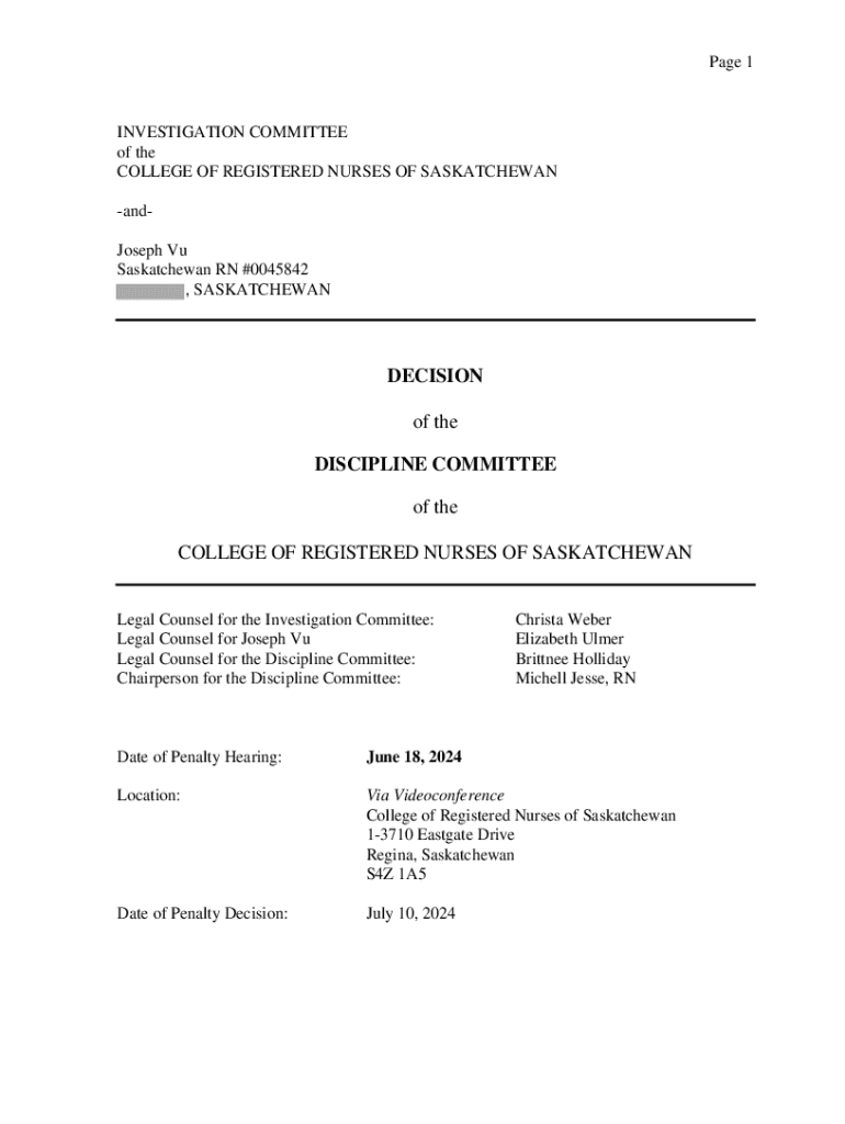 Page 1INVESTIGATION COMMITTEE of the COLLEGE OF REGISTERED NURSES OF SASKATCHEWAN andJoseph Vu Saskatchewan RN #0045842 , SASKATCHEWANDECISION of the DISCIPLINE COMMITTEE of the COLLEGE OF REGISTERED