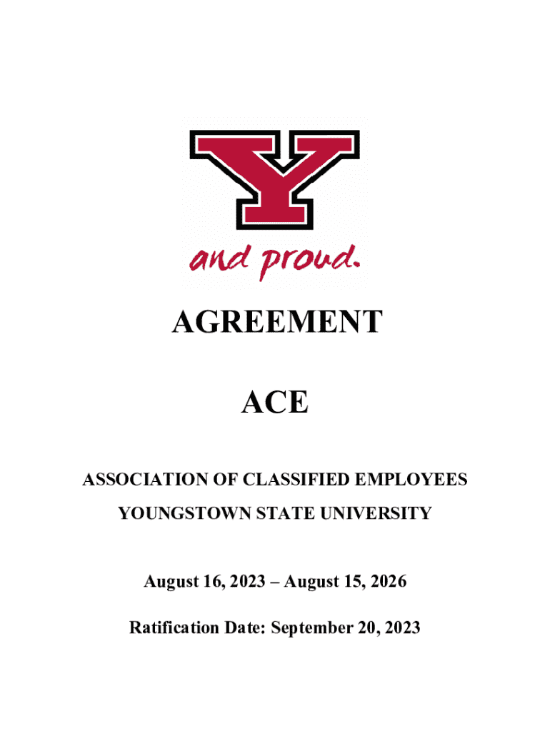 AGREEMENT ACE ASSOCIATION OF CLASSIFIED EMPLOYEES YOUNGSTOWN STATE UNIVERSITY August 16, 2023 August 15, 2026 Ratification Date: September 20, 2023AGREEMENT between YOUNGSTOWN STATE UNIVERSITY and