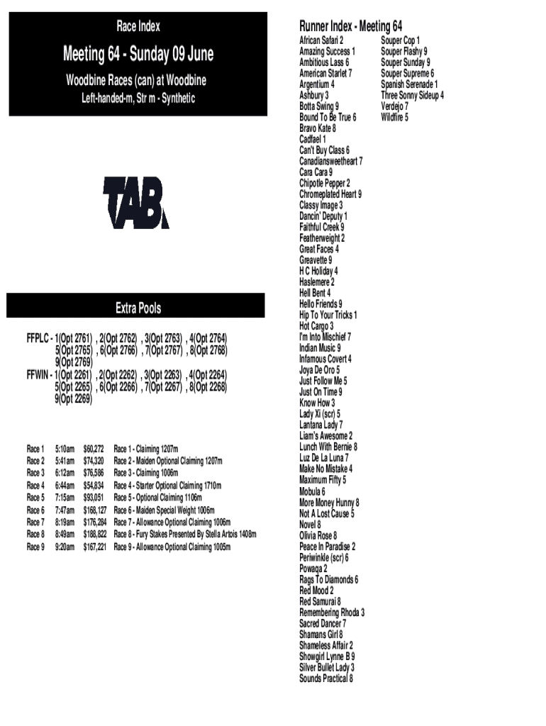 Race IndexMeeting 64 Sunday 09 June Woodbine Races (can) at Woodbine Lefthandedm, Str m SyntheticExtra Pools FFPLC 1(Opt 2761) 5(Opt 2765) 9(Opt 2769) FFWIN 1(Opt 2261) 5(Opt 2265) 9(Opt 2269)Race