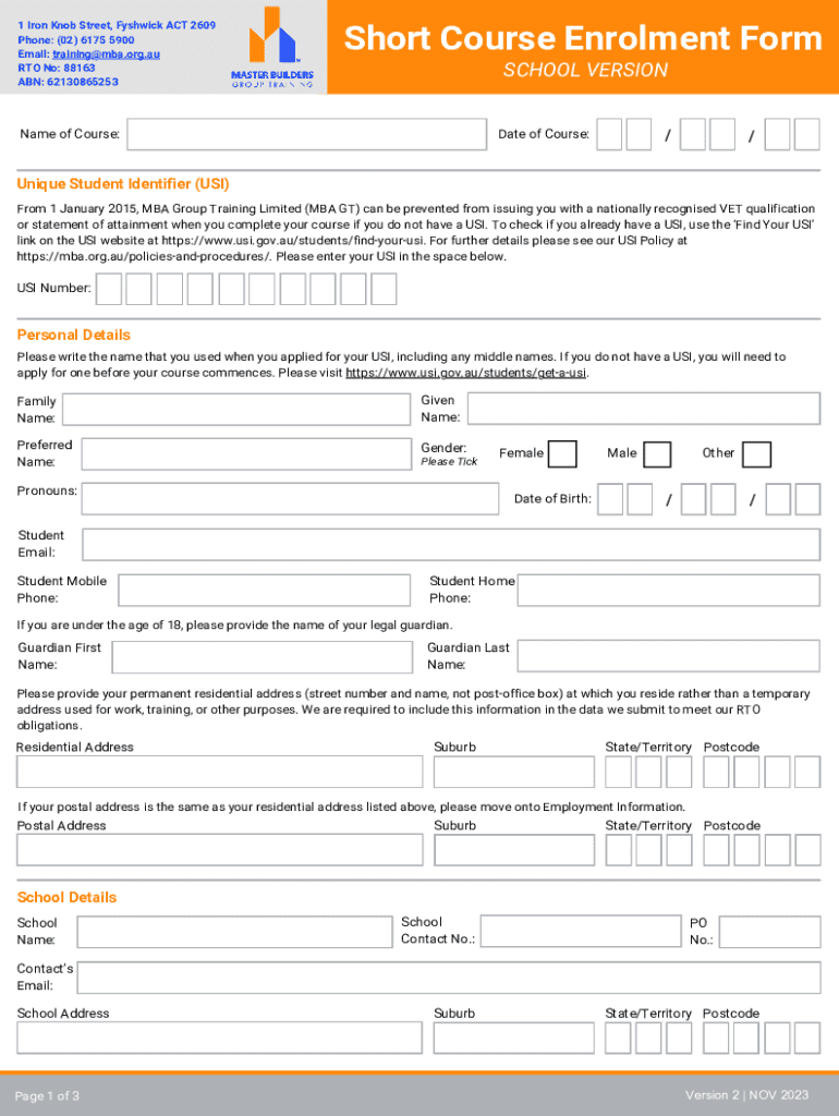 1 Iron Knob Street, Shtick ACT 2609 Phone: (02) 6175 5900 Email: training@mba.org.au RTO No: 88163 ABN: 62130865253Short Course Enrollment Form SCHOOL VERSIONName of Course:Date of Course://Unique