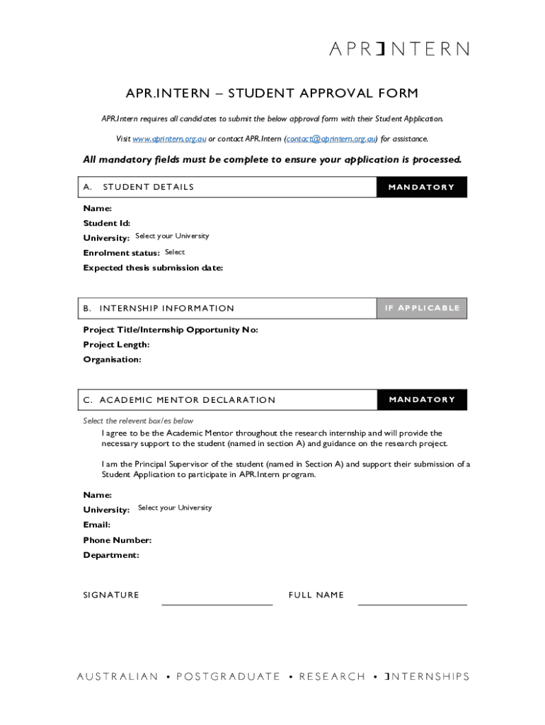 APR.INTERN STUDENT APPROVAL FORM APR. Intern requires all candidates to submit the below approval form with their Student Application. Visit www.aprintern.org.au or contact APR. Intern (contact@aprintern.org.au)