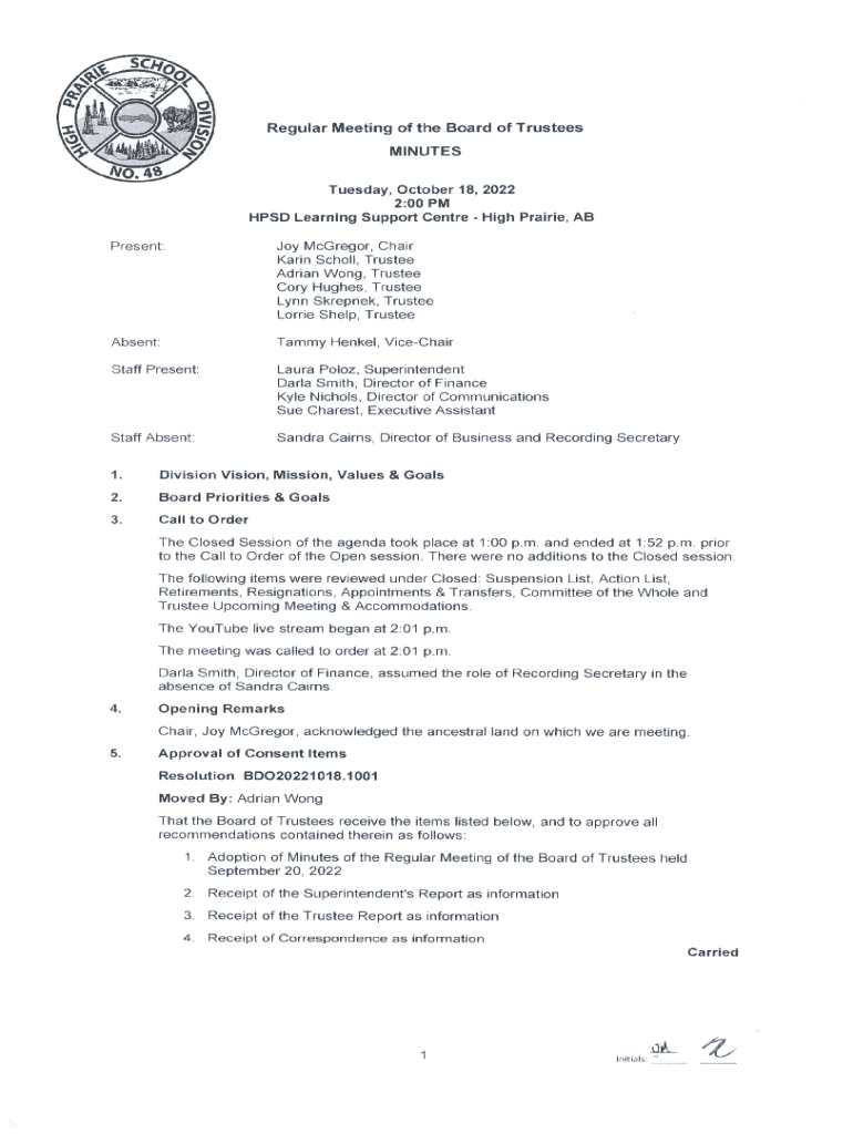 Regular Meeting of the Board of Trustees MINUTES Tuesday, October 18, 2022 2:00 PM HPSD Learning Support Centre High Prairie, AB Present:Joy McGregor, Chair Karin Scholl, Trustee Adrian Wong, Trustee