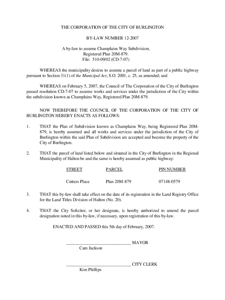 THE CORPORATION OF THE CITY OF BURLINGTON BYLAW NUMBER 122007 A bylaw to assume Champlain's Way Subdivision, Registered Plan 20M879. File: 51009/02 (CD707) WHEREAS the municipality desires to assume