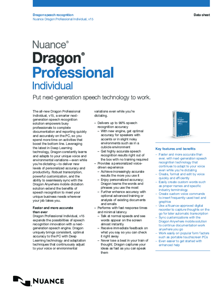 Dragon speech recognition Nuance Dragon Professional Individual, v15Data sheep next generation speech technology to work. The all new Dragon Professional Individual, v15, a smarter next generation
