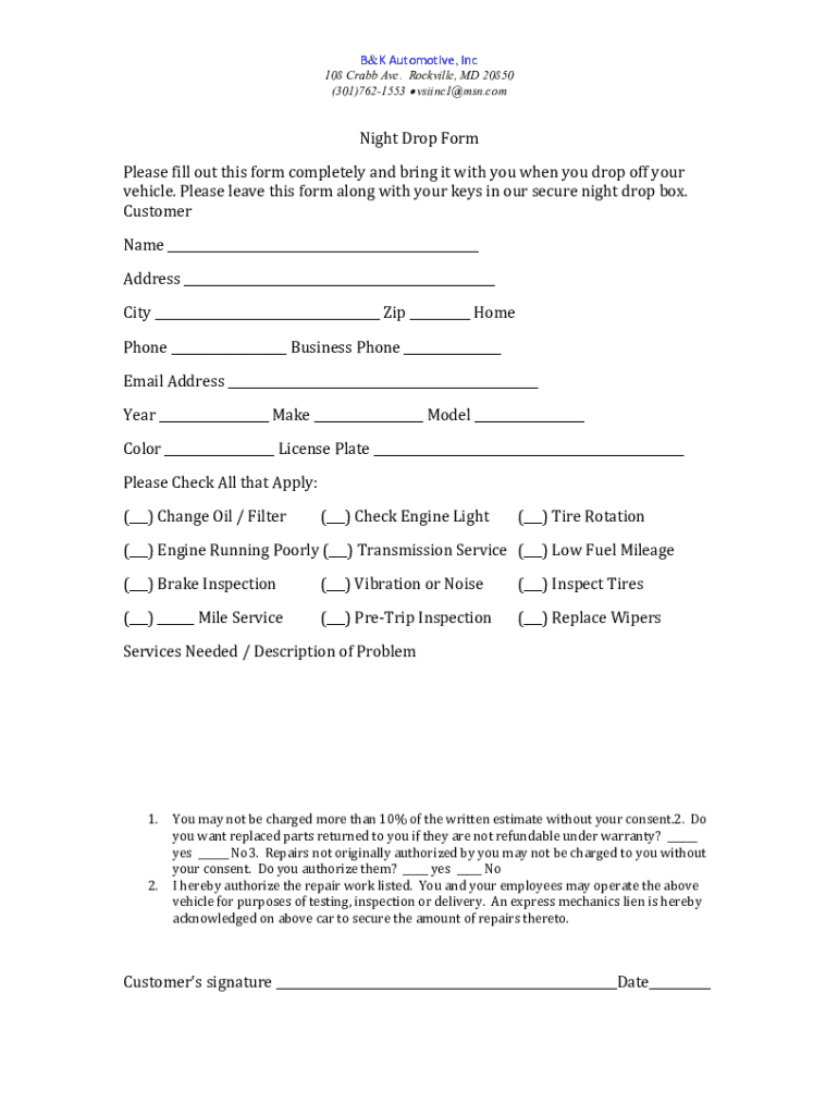 B&K Automotive, Inc 108 Crab Ave. Rockville, MD 20850 (301)7621553 vsiinc1@msn.comNight Drop Form Please fill out this form completely and bring it with you when you drop off your vehicle. Please