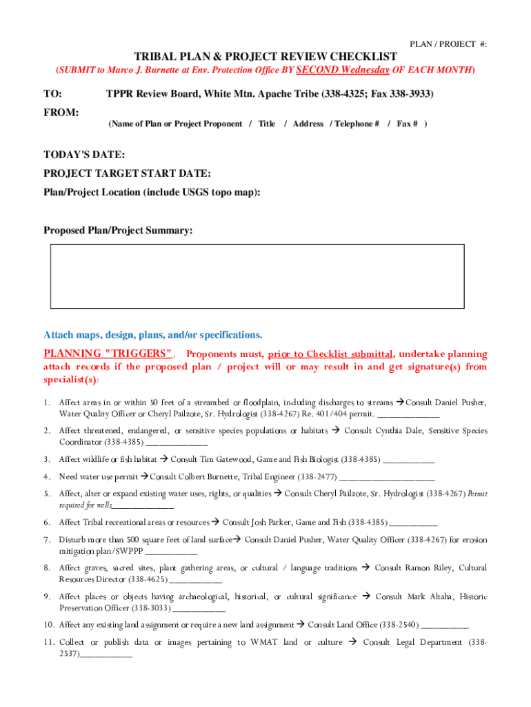 PLAN / PROJECT #:TRIBAL PLAN & PROJECT REVIEW CHECKLIST (SUBMIT to Marco J. Burnette at Env. Protection Office BY SECOND Wednesday OF EACH MONTH)TO:TPPR Review Board, White Mtn. Apache Tribe (3384325;