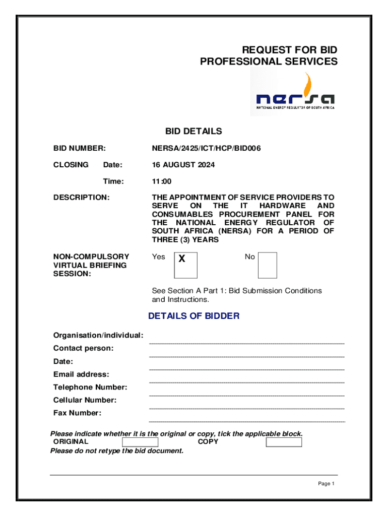 BID NUMBER:VERSA/2425/ICT/HCP/BID006CLOSINGDate:16 AUGUST 2024Time:11:00DESCRIPTION:THE APPOINTMENT OF SERVICE PROVIDERS TO