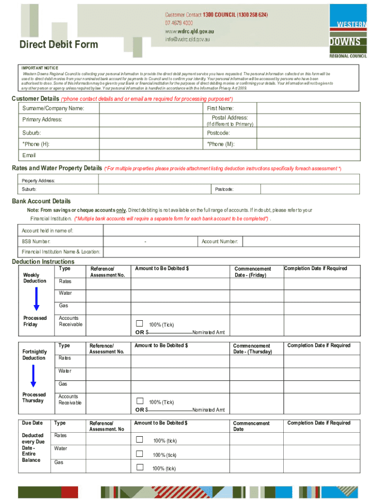 Direct Debit Form IMPORTANT NOTICE Western Downs Regional Council is collecting your personal information to provide the direct debit payment service you have requested. The personal information collected