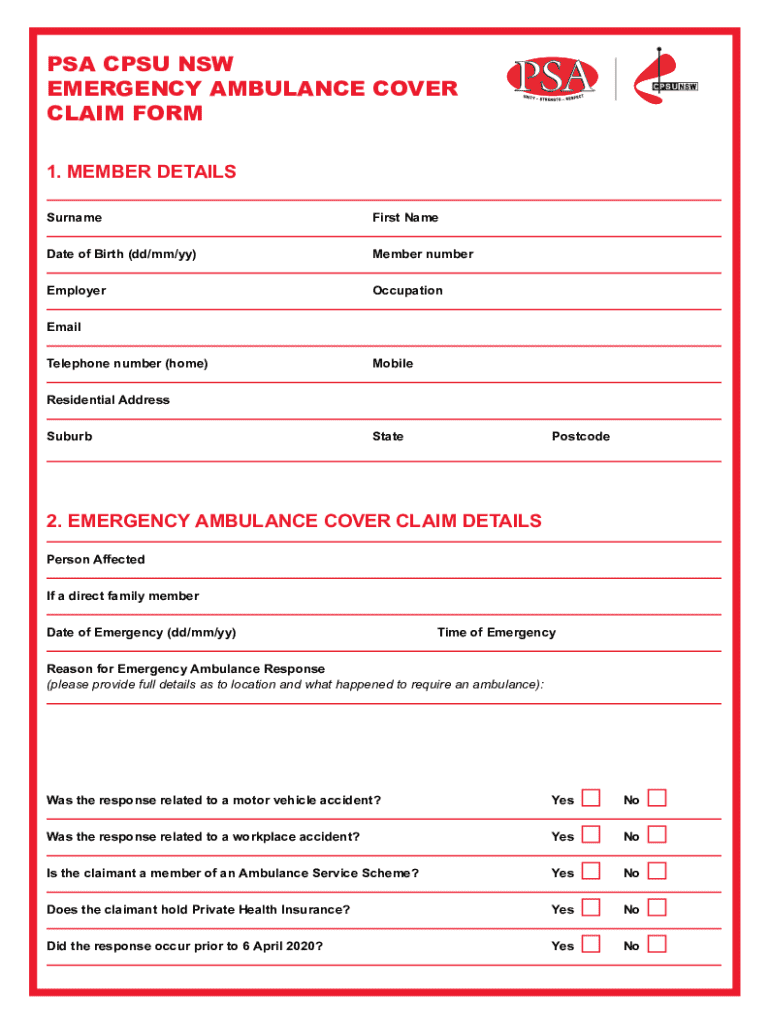 PSA CPU NSW EMERGENCY AMBULANCE COVER CLAIM FORM 1. MEMBER DETAILS SurnameFirst NameD ate of Birth (dd/mm/by)Member numberEmployerOccupationEmail Telephone number (home)MobileResidential Address SuburbStatePostcode2.