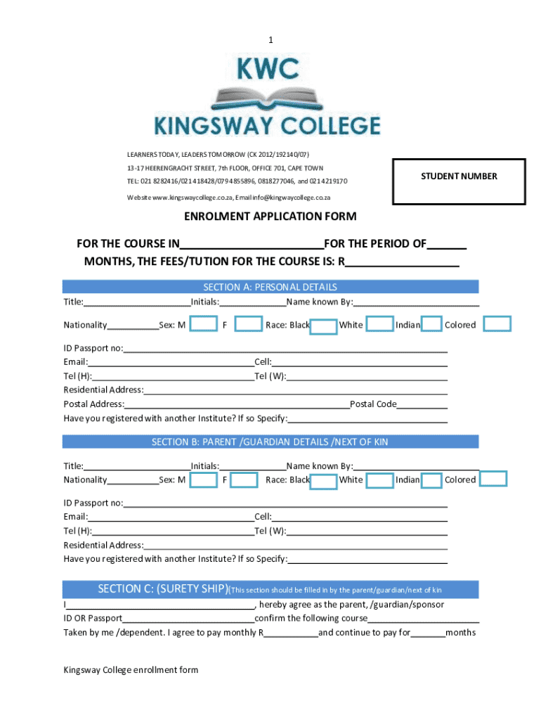 The Kingsway college enrollment form typically requires students to provide their name, contact information, course selections, and payment details.