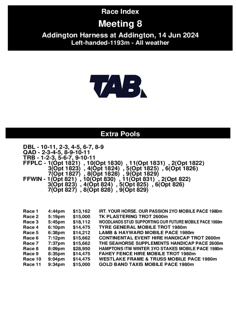 Race IndexMeeting 8 Addington Harness at Addington, 14 Jun 2024 Lefthanded1193m All weatherExtra Pools DBL 1011, 23, 45, 67, 89 HAD 2345, 891011 TRY 123, 567, 91011 FFP LC 1(Opt 1821), 10(Opt 1830),
