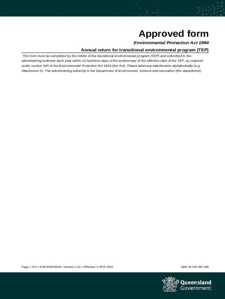 - Look for the Annual return for transitional environmental program (TEP). This must be completed by the holder of the transitional environmental program (TEP) and submitted to the administering authority each year within 22 business days of the anniversary of form in PDFfiller’s filebase.