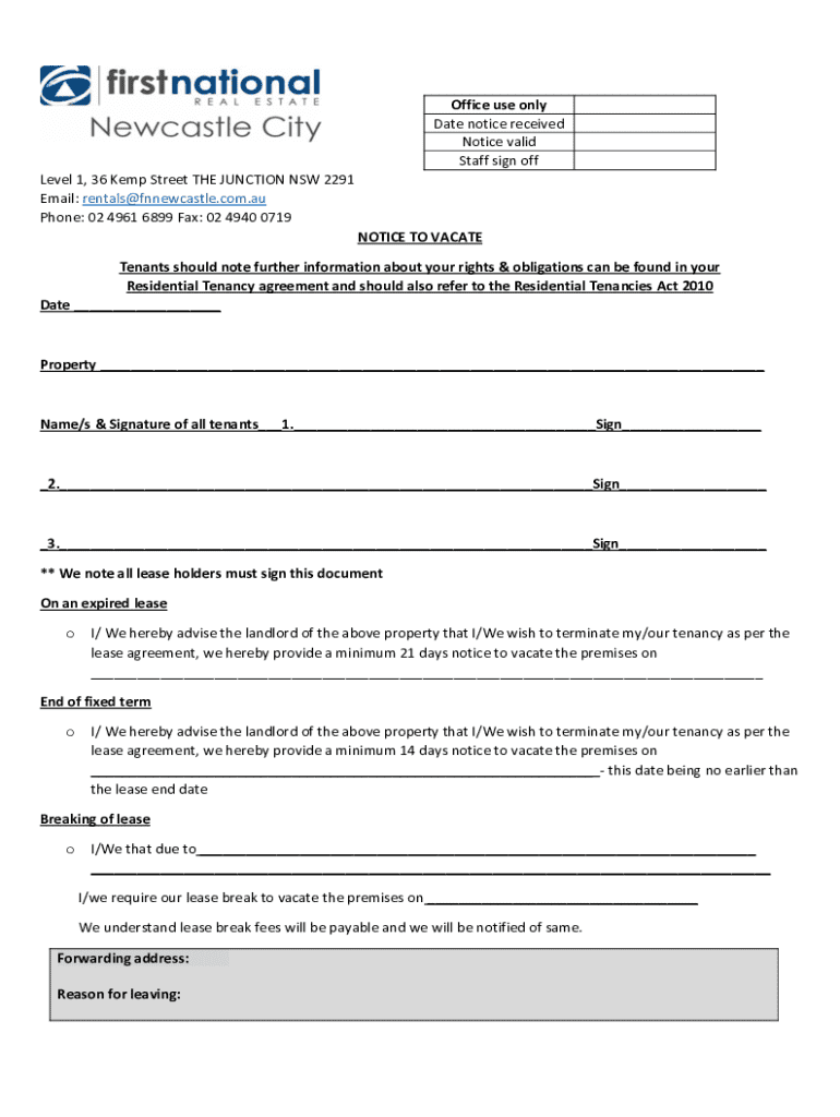 Office use only Date notice received Notice valid Staff sign off Level 1, 36 Kemp Street THE JUNCTION NSW 2291 Email: rentals@fnnewcastle.com.au Phone: 02 4961 6899 Fax: 02 4940 0719 NOTICE TO VACATE