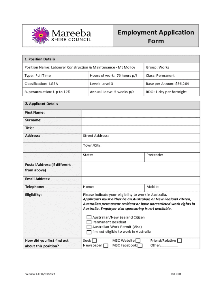 Get the free Position Name: Labourer Construction & Maintenance - Mt Molloy