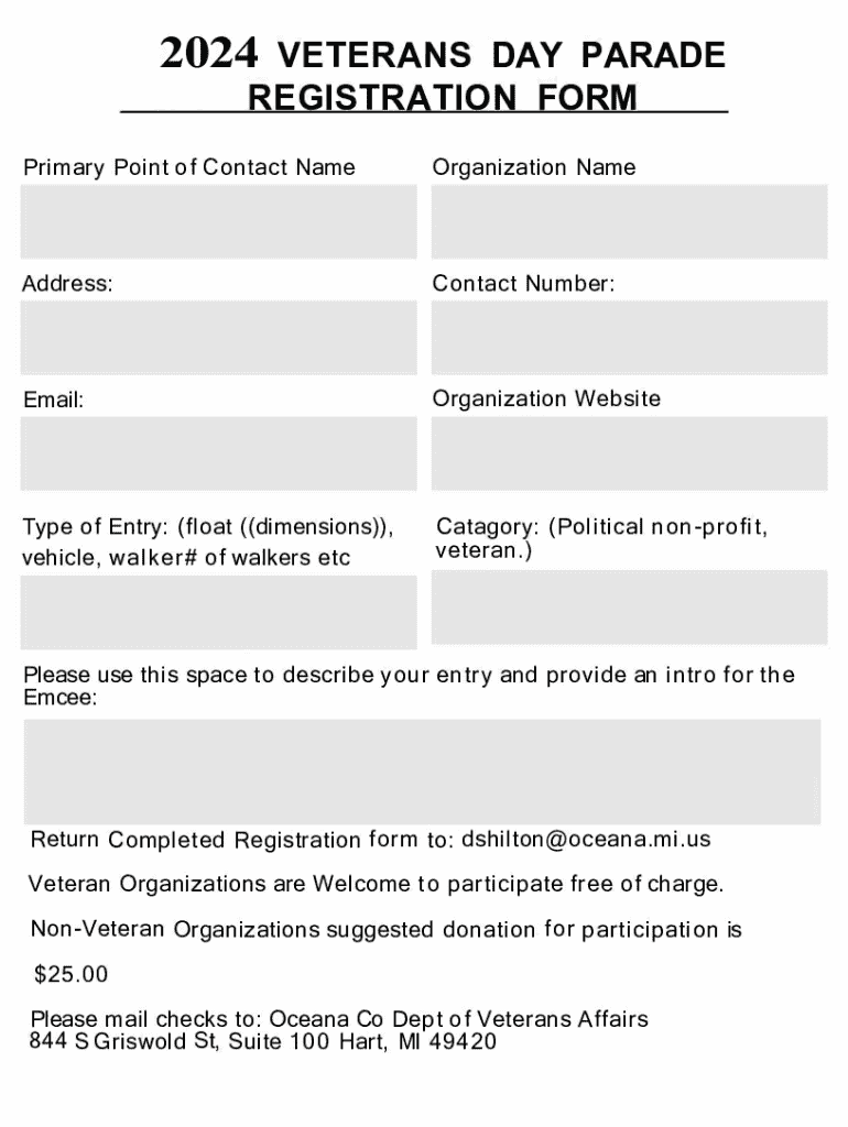 Get the free 2024 VETERANS DAY PARADE REGISTRATION FORM - oceana mi