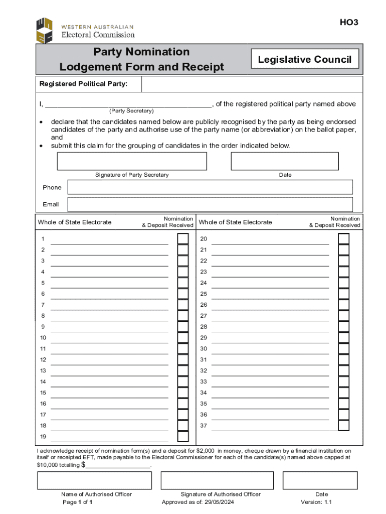 Get the free HO003 - Party Nomination Lodgement Form and Receipt - Legislative Council