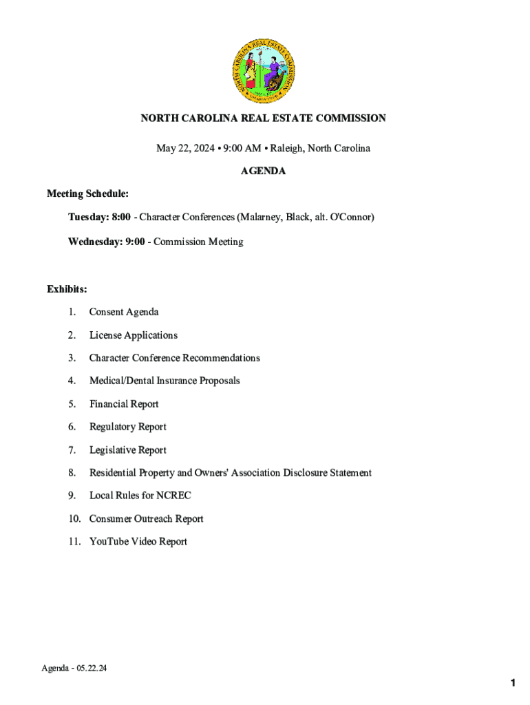 NORTH CAROLINA REAL ESTATE COMMISSION May 22, 2024 9:00 AM Raleigh, North Carolina AGENDA Meeting Schedule: Tuesday: 8:00 Character Conferences (Malaria, Black, alt. O\'Connor) Wednesday: 9:00 Commission