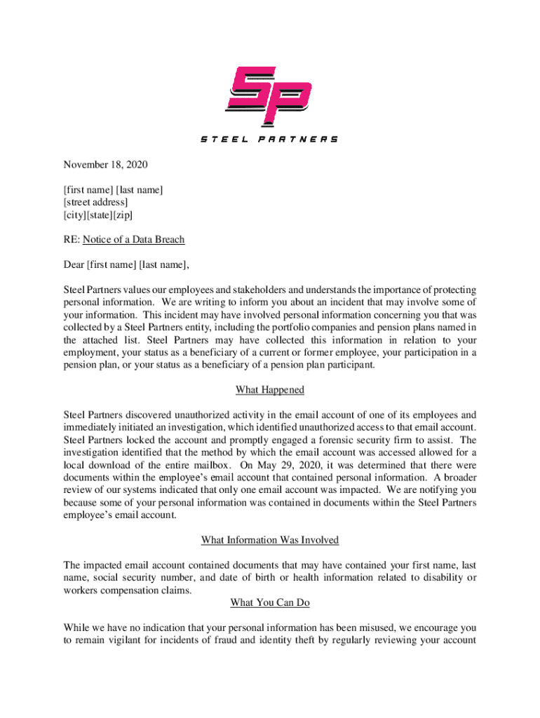 November 18, 2020 [first name] [last name] [street address] [city][state][zip] RE: Notice of a Data Breach Dear [first name] [last name], Steel Partners values our employees and stakeholders and understands