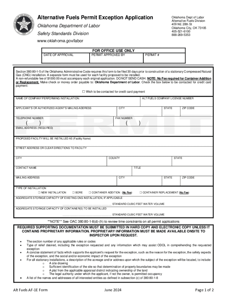 Alternative Fuels Permit Exception ApplicationOklahoma Dept of Labor Alternative Fuels Division 409 NE 28th St Oklahoma City, OK 73105 4055216100 8882695353Oklahoma Department of Labor Safety Standards