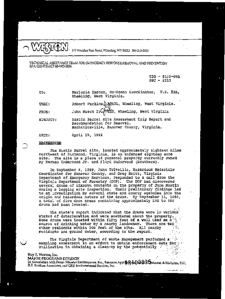 141 Waddles Run RO.NL, Wheeling, WV 26003 3042430800 TECHNICAL ASSISTANCE TEAM FOR EMERGENCY RESPONSE REMOVAL AND PREVENTION EPA CONTRACT 68WO0036. TDD 911209A PSC 2213oTO:Marjorie Eastern, Obscene